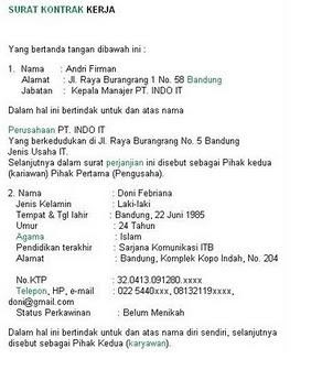 Penyusunan kontrak kerja berdasarkan dokumen perjanjian kinerja tempat. Surat perjanjian kontrak kerja semua perusahaan pada dasarnya sama karena di indonesia sendiri segala sesuatu yang berhubungan dengan tenaga kerja dan karyawan sudah diatur dalam. Kontrak kerja sangat penting kedudukannya. Untuk tau kamu pekerja yang bagaimana (soal kontrak) kita harus mengenali beberapa jenis perjanjian kerjanya. Jenis surat perjanjian kerja dan contoh.